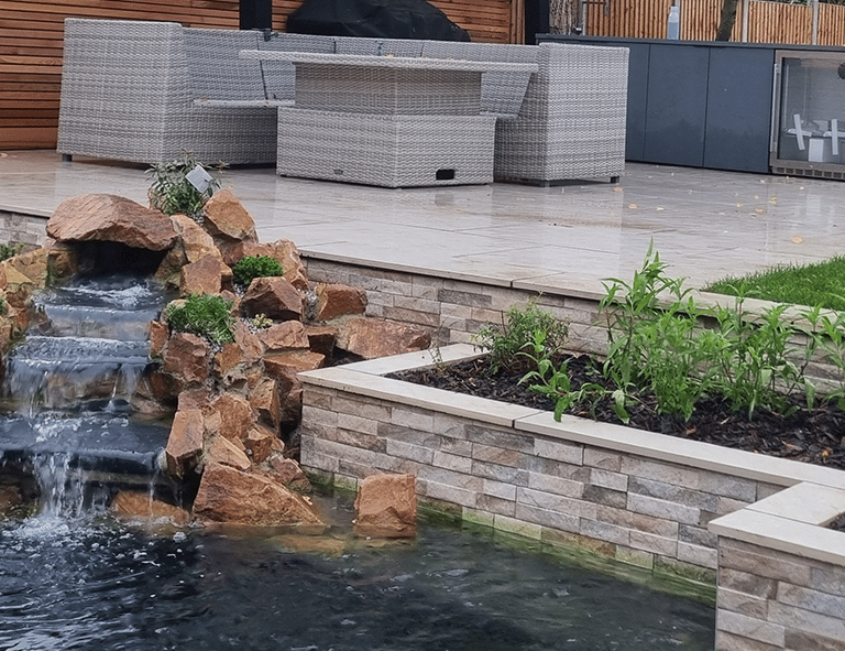 A recent clients property was valued before and after a year-long, 800m² full garden remodel — from ponds and waterfalls to patios and walls, outdoor kitchens, pergolas and planting throughout. Not a square inch was left untouched.