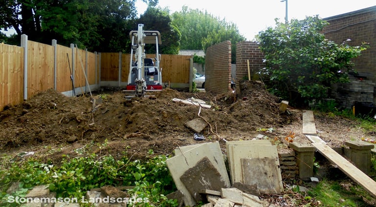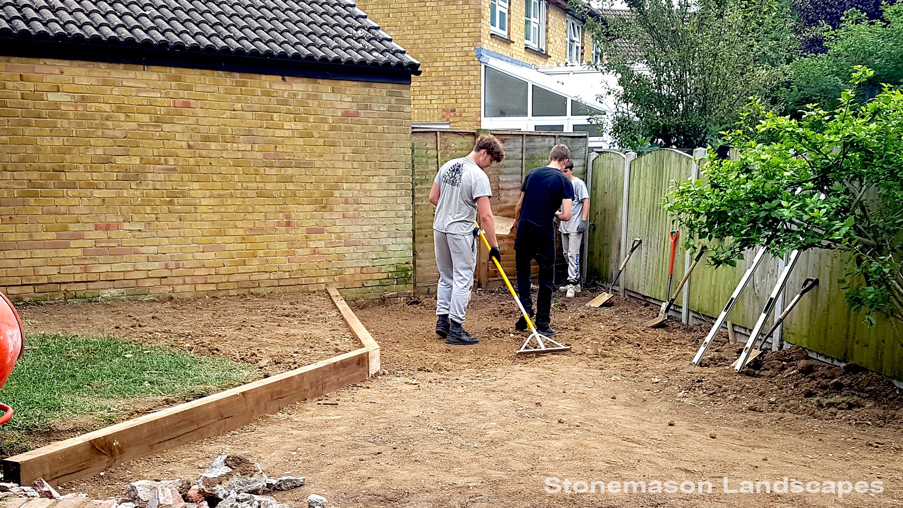 Due to a long garden with most work taking place at the bottom far end extra time had to be considered as fatigue sets in quickly for workers manoeuvring waste and materials back and forth through the large long garden.