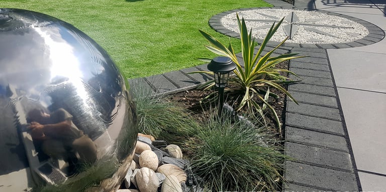 Design service, clearance, tree root removal, excessive ground work, 2 fences, fence painting, garden levelling, summer house garden office & concrete base, gutter & water management for garden office. porcelain patio with custom stone compass feature, circle artificial lawn & edging, water feature, lighting and plants.